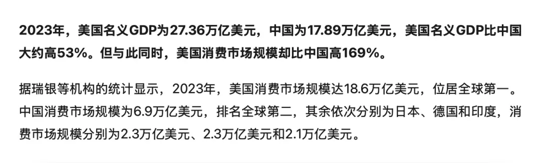 与之相比,美国2023年GDP按照可比价格折算成人民币,大约是193万亿,只比我国高大约53%。