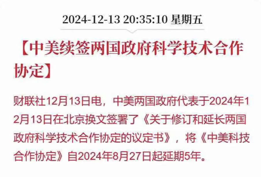 本周五,中美两国宣布续签《中美科技合作协定》,有效期自2024年8月27日起延期5年。