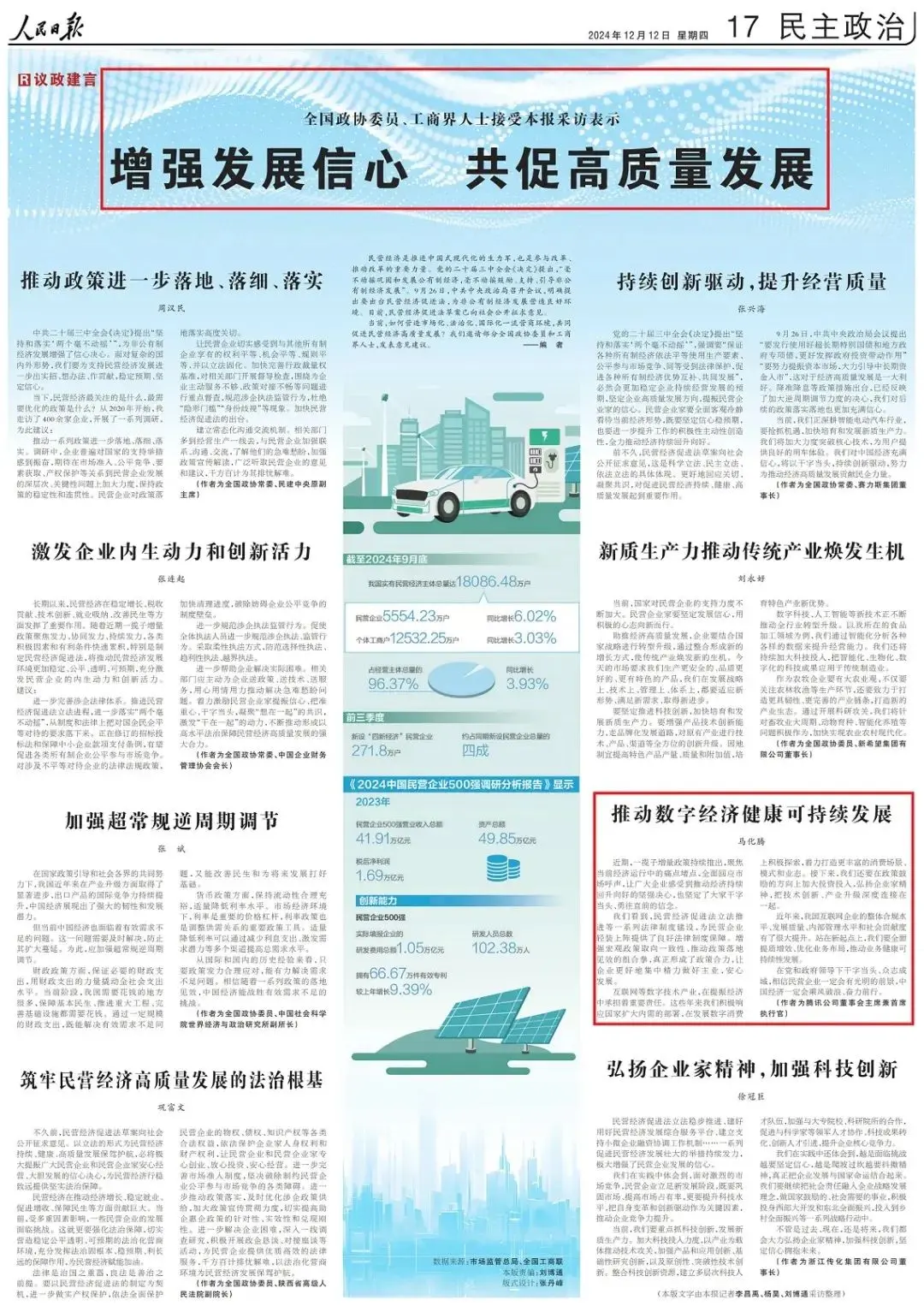 12月12日,马化腾在《人民日报》上发表署名文章《推动数字经济健康可持续发展》,表达了对民营经济的坚定信心,认为在政策支持和法律保障下,民营企业将迎来更好的发展机遇。
