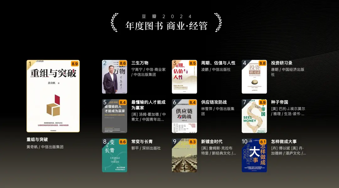 先给朋友们汇报个喜讯:本周四,豆瓣读书推出2024年度图书,咱们的《投资研习录》上榜【商业·经管】榜单。