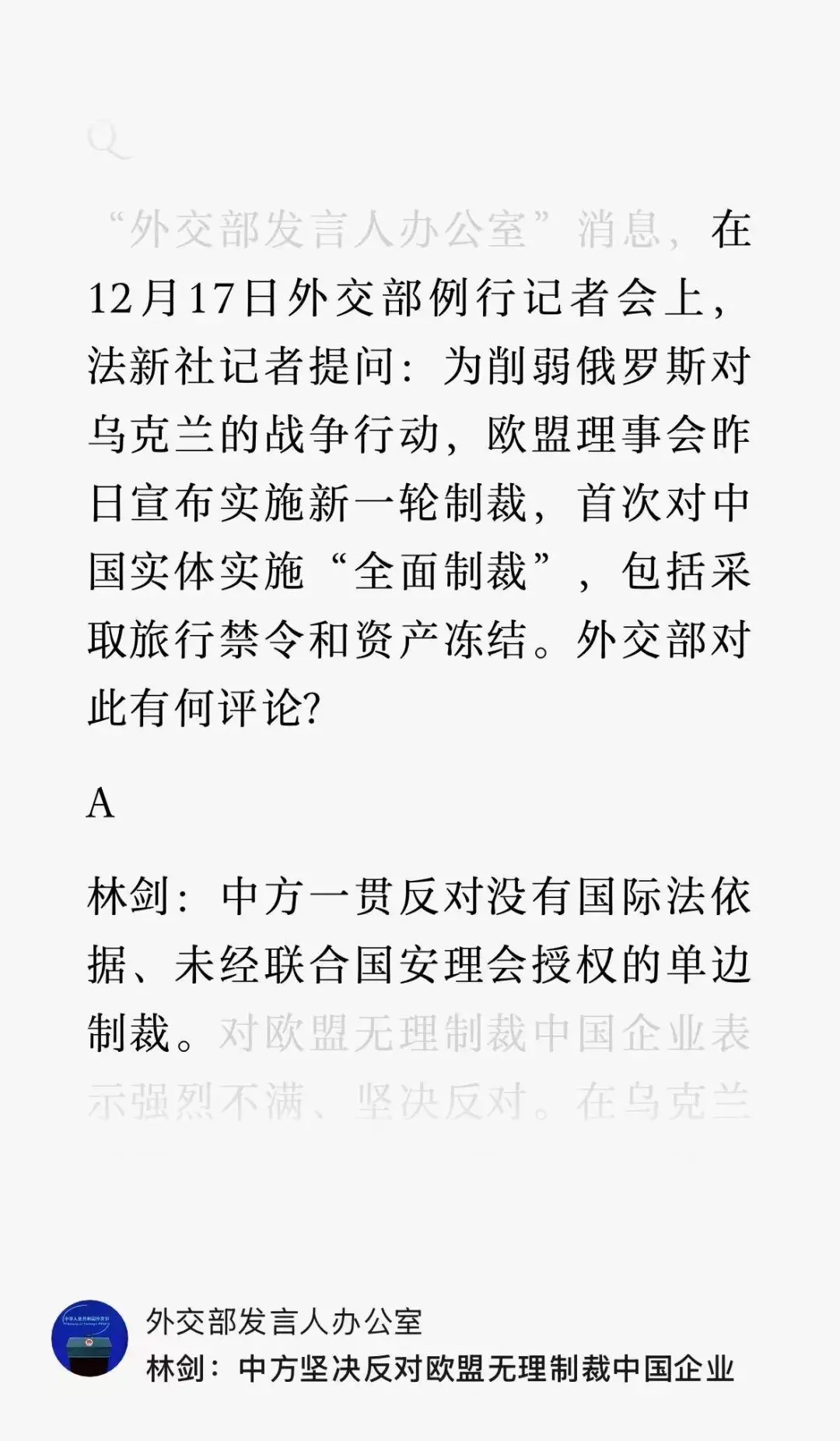 欧盟本周首次宣布全面制裁中国实体,我方已明确表示反对。