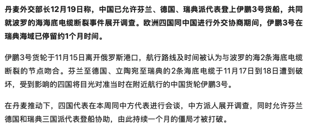 上次割断海底电缆的中国货船伊鹏3号,经过近一个月的协调,本周我国政府批准了欧洲几国的核查人员,登船核查。