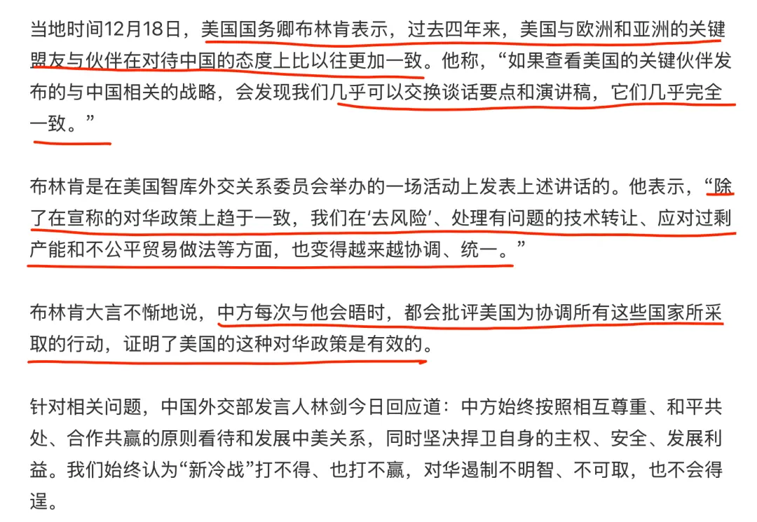 布林肯本周嚣张跋扈,扬言美欧亚关键盟友对中国的战略几乎完全一致,这都是我们老美努力的结果(没错,我承认是我搞的,你咬我啊,是不是这种感觉?),中国越反对,越说明我们干得对。